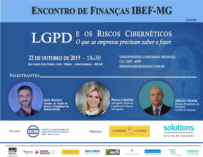 Dia 22 de outubro, a partir das 18h30, o Instituto Brasileiro de Executivos de Finanças (IBEF-MG), em conjunto com o Coimbra & Chaves Advogados e a Solutions Gestão de Seguros, promovem mais um “Encontro de Finanças”. Nesta edição o debate será sobre a Lei Geral de Proteção de Dados (LGPD) e todos os seus aspectos jurídicos e a gestão dos riscos nas empresas, com análise a partir de sua implantação, prevista para agosto de 2020.