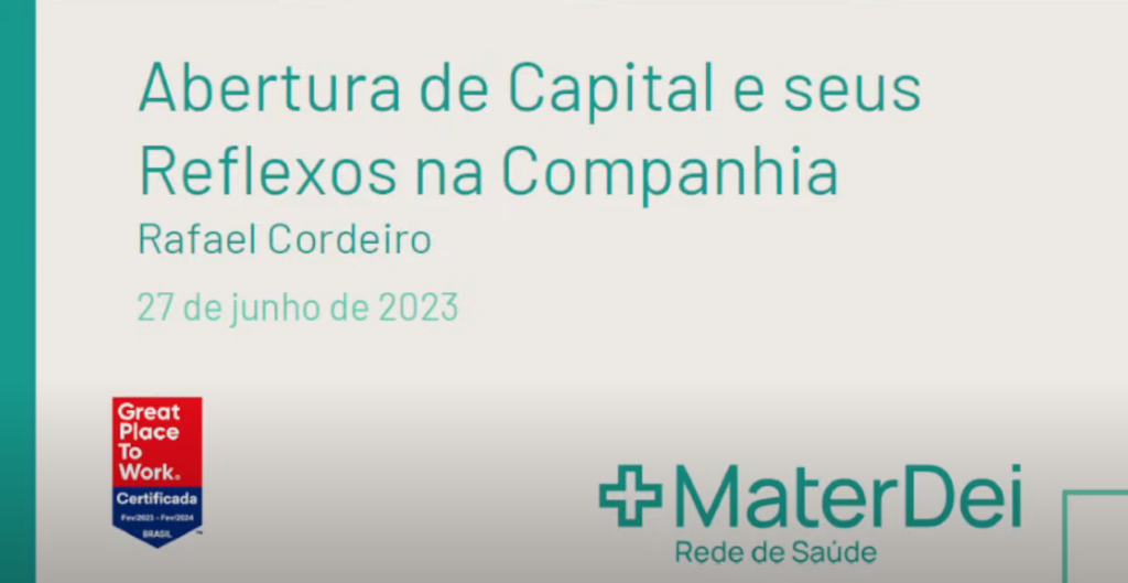 [vc_row][vc_column][vc_column_text]https://www.youtube.com/watch?v=jkLhq7Tg13c Data: 27/06/2023 Tipo de Evento: Palestra – Webinar Assunto: Abertura de Capital e seus reflexos na Companhia Palestrante:Rafael Cordeiro – CFO e Diretor de RI da Rede Mater Dei de Saude Local: Online Realizador: IBEF Minas Gerais Organização: IBEF Minas Gerais[/vc_column_text][/vc_column][/vc_row]