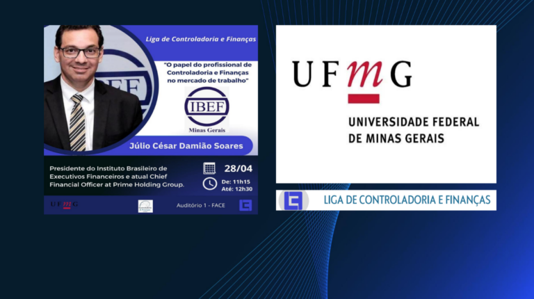 Data: 28.04.2022 Tipo de Evento: Palestra Presencial Assunto: O papel do profissional de Controladoria e Finanças no mercado de trabalho Palestrante:Júlio Damião – CFO Grupo Prime Holding e Presidente Executivo do IBEF-MG Local: Auditório 1 – FACE – UFMG e transmissão via YouTube Apoiador Institucional: IBEF Minas Gerais Organização: UFMG