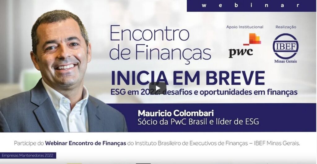 Data: 15.02.2022 Tipo de Evento: Palestra – Webinar Assunto: ESG em 2022: desafios e oportunidades em Finanças Palestrante: Mauricio Colombari, sócio da PwC Brasil e líder de ESG Local: Online Realizador: IBEF Minas Gerais Organização: IBEF Minas Gerais