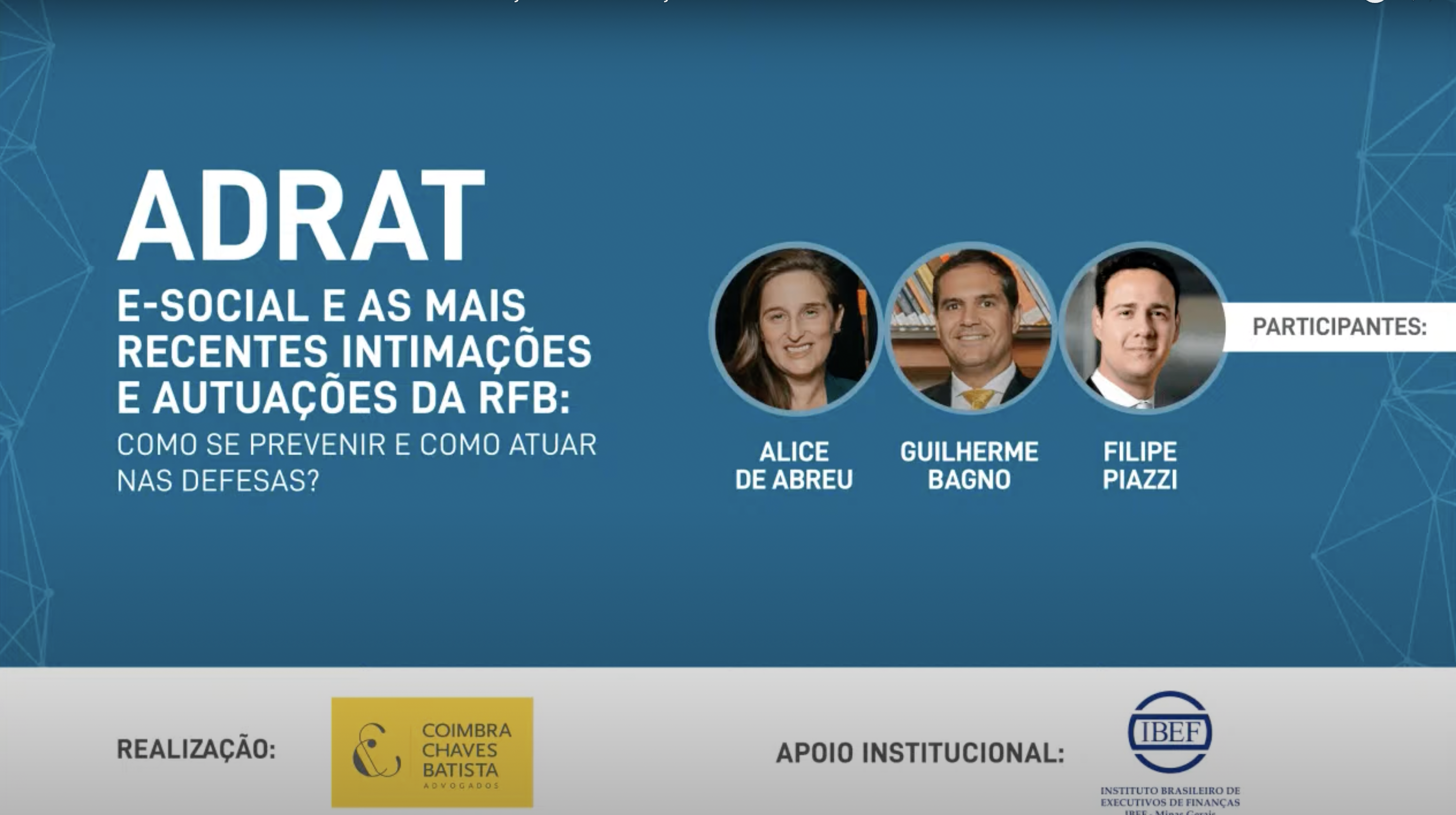 Data: 10.02.2022 Tipo de Evento: Palestra – Webinar Assunto: RETROSPECTIVA TRIBUTÁRIA 2021 E PERSPECTIVAS PARA 2022 Palestrante: Diversos acionistas CCBA Local: Online Apoiador institucional: IBEF Minas Gerais Organização: Coimbra & Chaves Advogados