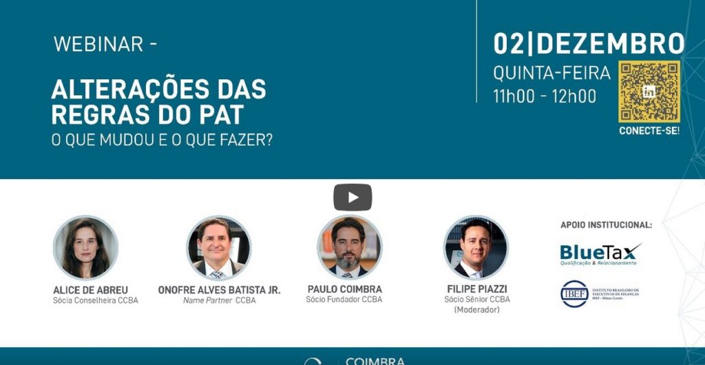 Data: 02.12.2021 Tipo de Evento: Palestra – Webinar: Assunto: Alterações das regras do PAT – O que mudou e o que fazer? Palestrante: Sócios do CCA Local: Online Realização: IBEF Minas Gerais