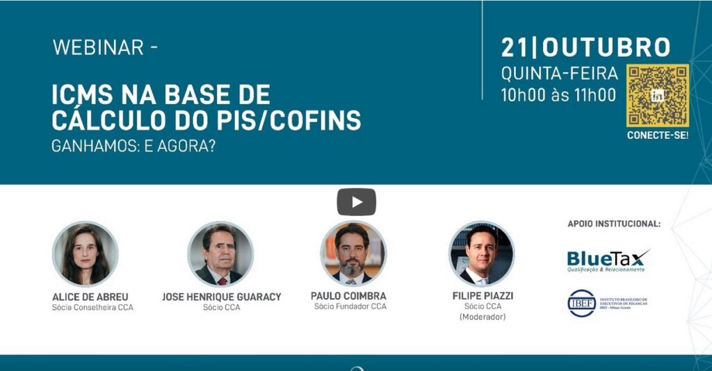 Data: 21.10.2021 Tipo de Evento: Palestra – Webinar: Assunto: ICMS na base de cálculo do PIS/COFINS. Ganhamos: e agora? Palestrante: Alice de Abreu, Jose Henrique Guaracy, Paulo Roberto Coimbra e Filipe Piazzi Local: Online Realização: IBEF Minas Gerais