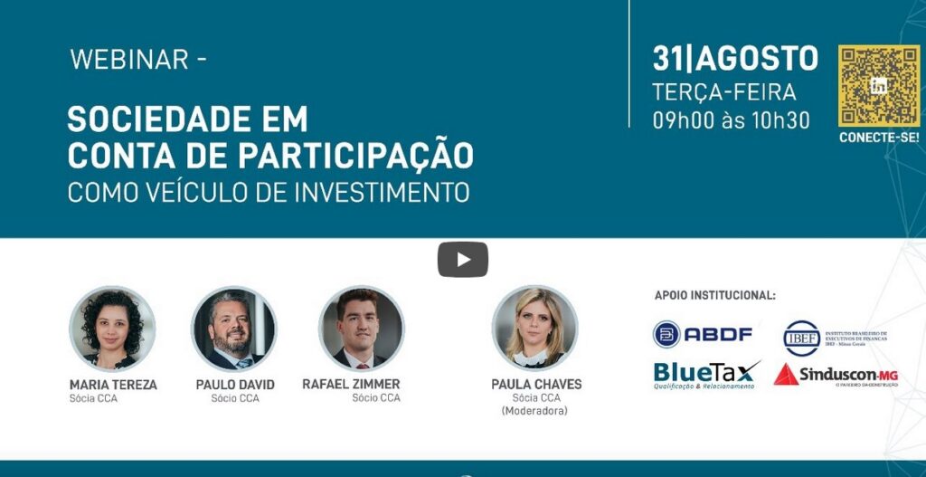 Data: 31.08.2021 Tipo de Evento: Palestra – Webinar: Assunto: Sociedades em Conta de Participação como veículo de investimento. Palestrante Sócios do CCA Local: Online Realização: IBEF Minas Gerais
