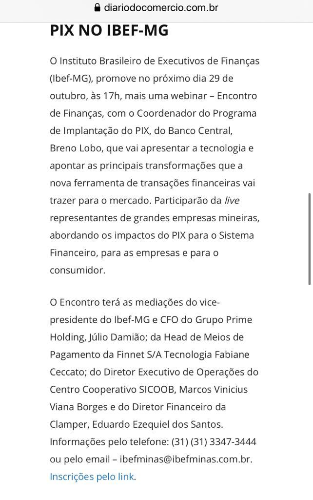 Blog do PCO http://blogdopco.com.br/pix-sera-o-tema-do-proximo-encontro-de-financas-do-ibef-mg/ BH Post Notícias PIX – Sistema de Pagamento Instantâneo Brasileiro será o tema do próximo Encontro de Finanças do IBEF-MG Cidade Conecta https://cidadeconecta.com/pix-e-o-tema-do-encontro-de-financas-do-ibef-mg/ Diário do Comercio